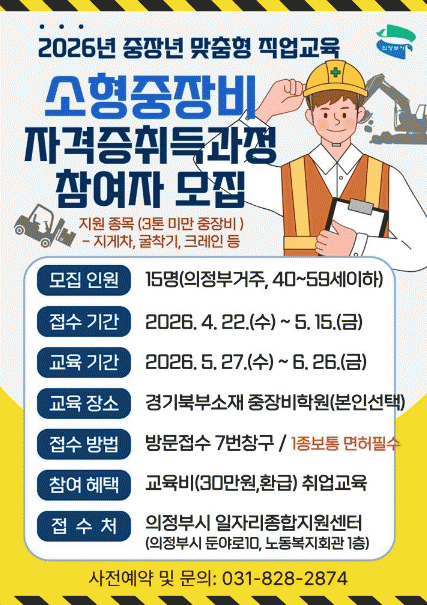 [NWS¹æ¼Û=Çѽ¸ñ ±âÀÚ]ÀÇÁ¤ºÎ½Ã´Â °ü³» ÁßÀå³âÃþ ±¸Á÷ÀÚÀÇ ÀçÃë¾÷À» Áö¿øÇϱâ À§ÇØ ¸ÂÃãÇü Á÷¾÷±³À°ÀÎ 1ÀÎ 1±â¼ú ¡®¼ÒÇüÁßÀåºñ ÀÚ°ÝÁõ Ãëµæ °úÁ¤¡¯ Âü¿©ÀÚ¸¦ ¸ðÁýÇÑ´Ù.