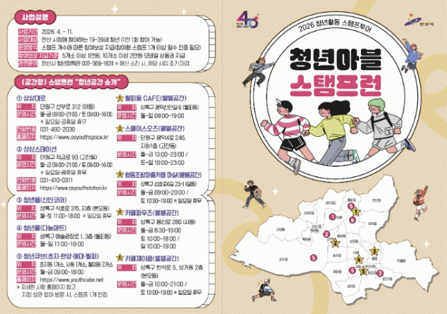 ¡®Ã»³â¸¶ºí ½ºÅÆÇÁ·±¡¯Àº ¿À´Â 27ÀϺÎÅÍ 11¿ù 30ÀϱîÁö ¿î¿µµÇ¸ç, ¾È»ê ½ÃÁ¤¿¡ Âü¿©ÇÏ´Â 19¼¼ºÎÅÍ 39¼¼±îÁöÀÇ Ã»³âÀÌ¸é ´©±¸³ª Âü¿©ÇÒ ¼ö ÀÖ´Ù. û³â°ø°£ ¹æ¹®°ú û³â Çà»ç Âü¿©¸¦ ¿¬°èÇÑ ½ºÅÆÇÁ Åõ¾î ¹æ½ÄÀ¸·Î ÁøÇàµÈ´Ù.