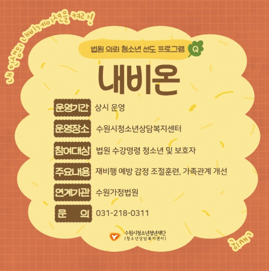 [NWS¹æ¼Û=Çѽ¸ñ ±âÀÚ]¼ö¿ø½Ãû¼Ò³âû³âÀç´Ü ¼ö¿ø½Ãû¼Ò³â»ó´ãº¹Áö¼¾ÅÍ´Â ¼ö¿ø °¡Á¤¹ý¿ø¿¡¼­ º¸È£Ã³ºÐ 2È£ ¼ö°­¸í·ÉÀ» ¹ÞÀº û¼Ò³âµéÀ» ´ë»óÀ¸·Î¡®³»ºñ¿Â¡¯(³» ÀλýÀÇ ³»ºñ°ÔÀ̼ÇÀ» ÄѶó!) ÇÁ·Î±×·¥À» ¿¬Áß ÁøÇàÇϰí ÀÖ´Ù. ¡®³»ºñ¿Â¡¯Àº¡¦