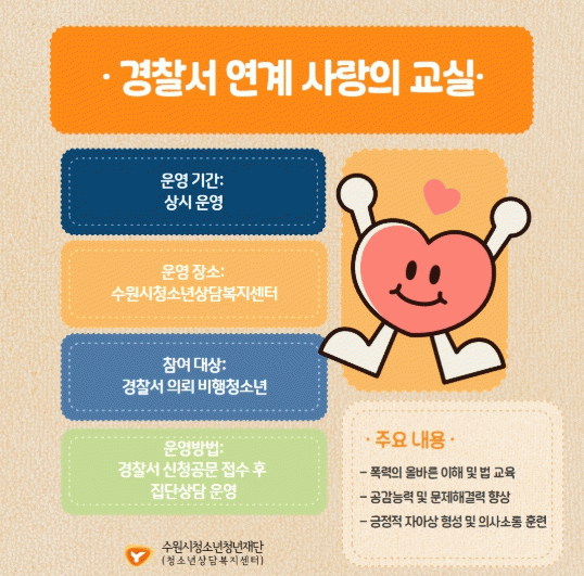 [NWS¹æ¼Û=Çѽ¸ñ ±âÀÚ]¼ö¿ø½Ãû¼Ò³âû³âÀç´Ü ¼ö¿ø½Ãû¼Ò³â»ó´ãº¹Áö¼¾ÅÍ´Â ¼ö¿ø¿µÅë°æÂû¼­¿Í ¼ö¿øÆÈ´Þ°æÂû¼­¿¡¼­ ÀÇ·ÚµÈ ºñÇàû¼Ò³âÀ» ´ë»óÀ¸·Î ¡®»ç¶ûÀÇ ±³½Ç¡¯ÇÁ·Î±×·¥À» ¿¬Áß ¿î¿µÇϰí ÀÖ´Ù. ¡®»ç¶ûÀÇ ±³½Ç¡¯Àº û¼Ò³âÀÇ ÀçºñÇàÀ» ¿¹¹æ¡¦