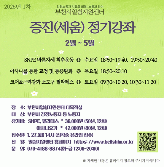 [»çȸ] ºÎõ½Ã ÀϽ°Áö¿ø¼¾ÅÍ, °¨Á¤³ëµ¿ÀÚ ÁõÁø°­Á Âü°¡ÀÚ ¸ðÁý |2026. 01.22