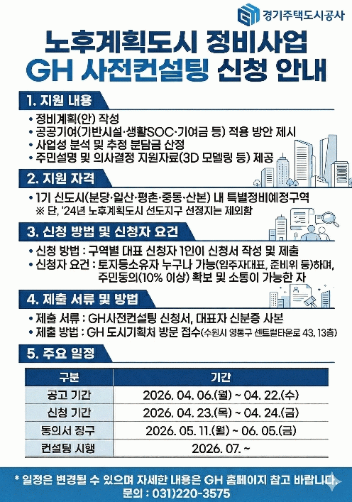 [NWS¹æ¼Û=Çѽ¸ñ ±âÀÚ]°æ±âÁÖÅõµ½Ã°ø»ç(GH)°¡ Áö³­ÇØ¿¡ ÀÌ¾î ³ëÈİèȹµµ½Ã Á¤ºñ»ç¾÷ÀÇ Ã¼°èÀûÀÌ°í ½Å¼ÓÇÑ ÃßÁøÀ» Áö¿øÇϱâ À§ÇØ ¡®³ëÈİèȹµµ½Ã Á¤ºñ»ç¾÷ GH»çÀüÄÁ¼³ÆÃ¡¯À» ½Ç½ÃÇÑ´Ù°í 6ÀÏ ¹àÇû´Ù. À̹ø ÄÁ¼³ÆÃÀº °æ±âµµ ³» 1±â ½Åµµ½Ã¡¦