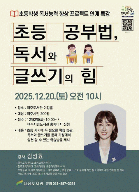 [»çȸ] ¿©Áֽà ´ë½Åµµ¼­°ü, 'ÃÊµî °øºÎ¹ý, µ¶¼­¿Í ±Û¾²±âÀÇ Èû' Ư°­ °³ÃÖ |2025. 12.05
