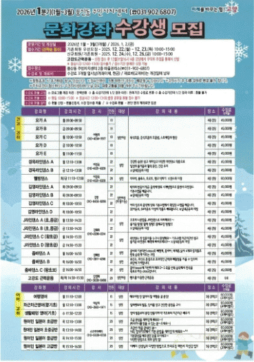 [»çȸ] °í¾ç½Ã dz»êµ¿ ÁÖ¹ÎÀÚġȸ, 2026³â 1ºÐ±â ÁÖ¹ÎÀÚÄ¡¼¾ÅÍ ¹®È­°­Á ¼ö°­»ý ¸ðÁý |2025. 12.17