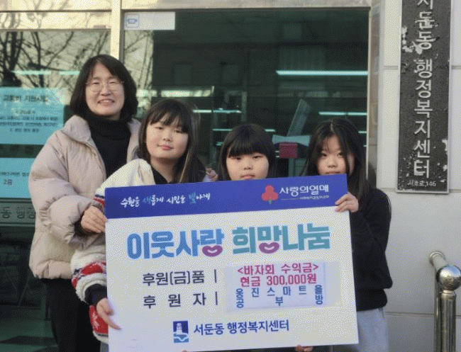 [NWS¹æ¼Û=Çѽ¸ñ ±âÀÚ]¼ö¿ø½Ã ±Ç¼±±¸ ¼­µÐµ¿¿¡ À§Ä¡ÇÑ ¿õÁø½º¸¶Æ®¿Ã Ŭ·¡½º´Â Áö³­ 24ÀÏ ÀÌ¿ôÀ» À§ÇØ Çø®¸¶ÄÏ ¼öÀÍ±Ý 300,000¿øÀ» ¼­µÐµ¿ÇàÁ¤º¹Áö¼¾ÅÍ¿¡ ±âºÎÇß´Ù. Àü´ÞµÈ ±âºÎ±ÝÀº Áö³­ 24ÀÏ °øºÎ¹æ ¡®¼­µÐ ¿õÁø½º¸¶Æ®¿ÃŬ·¡½º¡¯¿Í »ç¡¦