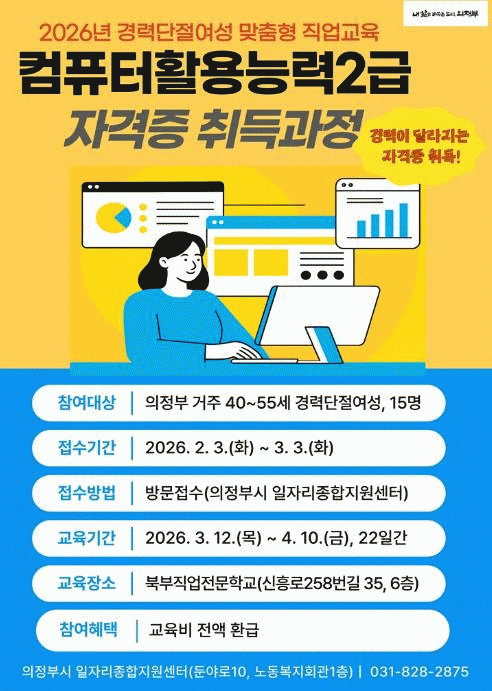 [NWS¹æ¼Û=Çѽ¸ñ ±âÀÚ]ÀÇÁ¤ºÎ½Ã´Â °æ·Â´ÜÀý¿©¼ºÀÇ Ãë¾÷¿ª·® °­È­¸¦ À§ÇØ 2¿ù 3ÀϺÎÅÍ 3¿ù 3ÀϱîÁö ¡®ÄÄÇ»ÅÍȰ¿ë´É·Â2±Þ ÀÚ°ÝÁõ Ãëµæ°úÁ¤¡¯ Âü¿©ÀÚ¸¦ ¸ðÁýÇÑ´Ù. À̹ø ±³À°Àº ÀÚ°Ý ÃëµæÀ» ÅëÇØ °æ·Â´ÜÀý¿©¼ºÀÇ ÀçÃë¾÷ ±âȸ¸¦ ³ÐÈ÷±â À§ÇØ ¡¦