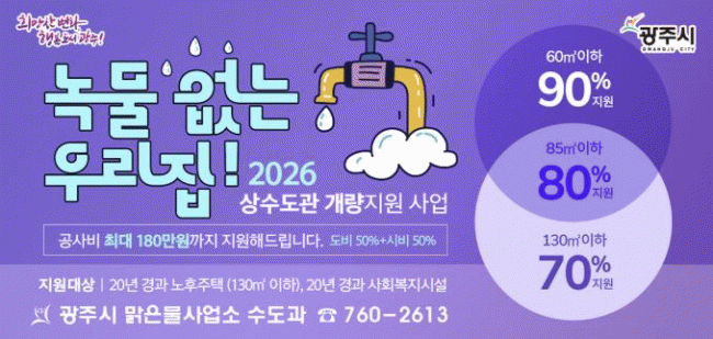 [»çȸ] ±¤ÁÖ½Ã, '³ì¹° ¾ø´Â ¿ì¸® Áý ¼öµµ°ü °³·® Áö¿ø»ç¾÷' ÃßÁø¡¦³ëÈÄÁÖÅà ÃÖ´ë 180¸¸ ¿ø Áö¿ø |2026. 01.23