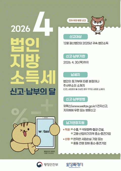 [»çȸ] È­¼ºÆ¯·Ê½Ã, 2025³â ±Í¼Ó ¹ýÀÎÁö¹æ¼Òµæ¼¼ 4¿ù 30ÀϱîÁö ½Å°í¡¤³³ºÎ ¾È³» |2026. 04.06