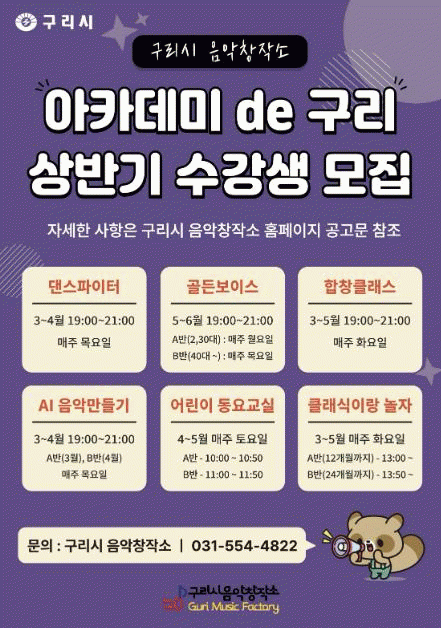[NWS¹æ¼Û=Çѽ¸ñ ±âÀÚ]±¸¸®½Ã´Â ÀáÀçÀû ¿¹¼úÀÎ ¾ç¼ºÀ» À§ÇØ ±¸¸®½Ã À½¾ÇâÀÛ¼Ò¿¡¼­ ¿î¿µÇÏ´Â '2026 »ó¹Ý±â ¾ÆÄ«µ¥¹Ì de¡¯±¸¸®'ÀÇ ¼ö°­»ýÀ» 2¿ù 2ÀϺÎÅÍ ¸ðÁýÇϰí ÀÖ´Ù°í ¹àÇû´Ù. '2026 ¾ÆÄ«µ¥¹Ì de¡¯±¸¸®'´Â ¹é°æÇö ½ÃÀåÀÇ °ø¾à »ç¾÷ÀÎ ¡¦