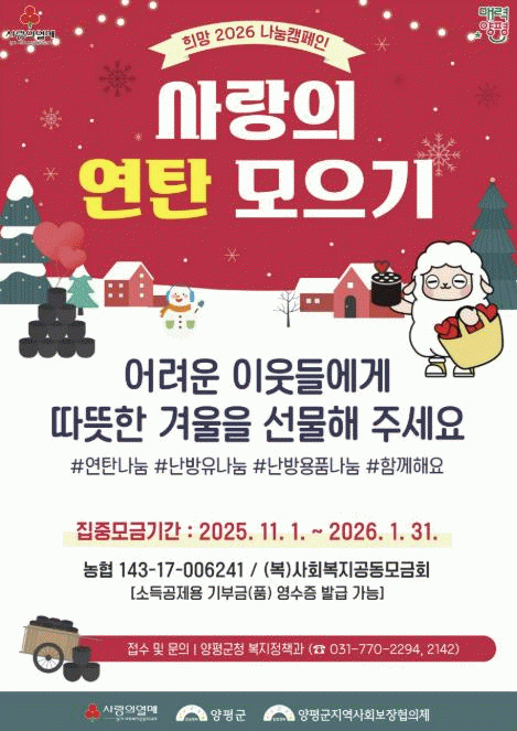 [NWS¹æ¼Û=Çѽ¸ñ ±âÀÚ]¾çÆò±º°³ÀÎÅýÿî¼Û»ç¾÷Á¶ÇÕÀº Áö³­ 29ÀÏ °ü³» Ãë¾à°èÃþÀÇ µû¶æÇÑ °Ü¿ï³ª±â¸¦ Áö¿øÇϱâ À§ÇØ ¡®Èñ¸Á 2026 ³ª´®Ä·ÆäÀÎ »ç¶ûÀÇ ¿¬Åº¸ðÀ¸±â¡¯ ¼º±Ý 200¸¸ ¿øÀ» ±âŹÇß´Ù. ¾çÆò±º°³ÀÎÅýÿî¼Û»ç¾÷Á¶ÇÕÀº Áֹΰú °ü±¤°´¡¦