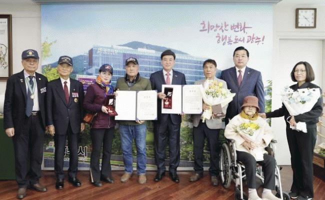 [NWS¹æ¼Û=Çѽ¸ñ ±âÀÚ]±¤Áֽô Áö³­ 9ÀÏ 6¡¤25ÀüÀï¿¡ ÂüÀüÇØ °øÀ» ¼¼¿î °í ÃÖ±¤º¹ ÇÏ»ç¿Í °í °­Ã¢È£ »ó»çÀÇ À¯°¡Á·¿¡°Ô È­¶û¹«°øÈÆÀå°ú Áõ¼­¸¦ Àü´ÞÇß´Ù. À̳¯ Àü´Þ½Ä¿¡´Â ¹æ¼¼È¯ ½ÃÀå°ú º¸ÈÆ´ÜüÇùÀÇȸÀå, ¹«°ø¼öÈÆÀÚȸÀå, 6¡¤25ÂüÀüÀ¯¡¦