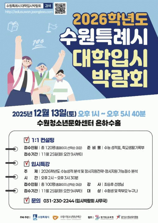 [NWS¹æ¼Û=Çѽ¸ñ ±âÀÚ]¼ö¿ø½Ãû¼Ò³âû³âÀç´Üû¼Ò³âÈñ¸Áµî´ë´Â 2026Çг⵵ ´ëÀÔÀ» ÁغñÇÏ´Â ¼öÇè»ý°ú Çкθ𸦠À§ÇØ ¿À´Â 12¿ù 13ÀÏ ¼ö¿øÃ»¼Ò³â¹®È­¼¾ÅÍ¿¡¼­ ¡®¼ö¿øÆ¯·Ê½Ã 2026Çг⵵ ´ëÇÐÀԽùڶ÷ȸ¡¯¸¦ °³ÃÖÇÑ´Ù. ¹Ú¶÷ȸ´Â À̳¯ ¿ÀÈÄ 1½Ã¡¦