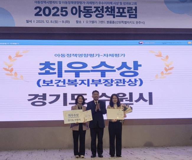 [NWS¹æ¼Û=Çѽ¸ñ ±âÀÚ]¼ö¿øÆ¯·Ê½Ã°¡ º¸°Çº¹ÁöºÎ¡¤¾Æµ¿±Ç¸®º¸Àå¿øÀÌ ÁÖ°üÇÏ´Â ¡®2025³â ¾Æµ¿Á¤Ã¥¿µÇâÆò°¡¡¯¿¡¼­ ¿ì¼ö ÁöÀÚü·Î ¼±Á¤µÅ º¸°Çº¹ÁöºÎÀå°ü»óÀ» ¹Þ¾Ò´Ù. ½Ã»ó½ÄÀº 8ÀÏ ¿øÁֽà ¿ÀÅ©¹ë¸®¸®Á¶Æ®¿¡¼­ ¿­¸° ¡®Á¦13ȸ ¾Æµ¿Á¤Ã¥Æ÷·³¡¯ ¡¦