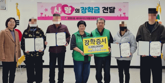 [NWS¹æ¼Û=Çѽ¸ñ ±âÀÚ]±¤¸í½Ã ±¤¸í5µ¿ »õ¸¶À»ÁöµµÀÚÇùÀÇȸ¿Í »õ¸¶À»ºÎ³àȸ´Â Áö³­ 25ÀÏ µµ¿òÀÌ ÇÊ¿äÇÑ °¡Á¤ÀÇ ´ëÇлý 4¸í¿¡°Ô °¢ 100¸¸ ¿ø¾¿ ÃÑ 400¸¸ ¿øÀÇ ÀåÇбÝÀ» Àü´ÞÇß´Ù. À̹ø Çà»ç´Â Çо÷¿¡ ¸ÅÁøÇÏ´Â °ü³» Àú¼Òµæ °¡Á¤ ÇлýµéÀ» ¡¦