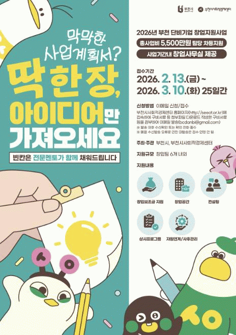[»çȸ] ºÎõ½Ã, '2026³â ºÎõ´Üºñ±â¾÷ â¾÷Áö¿ø»ç¾÷' Âü°¡ÀÚ ¸ðÁý |2026. 03.04
