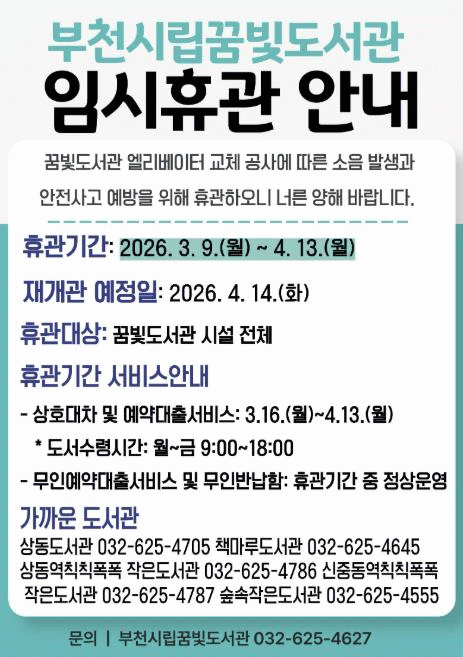 [»çȸ] ºÎõ½Ã¸³²Þºûµµ¼­°ü, ¿¤¸®º£ÀÌÅÍ ±³Ã¼ °ø»ç·Î 3¿ù 9ÀϺÎÅÍ ÀÓ½ÃÈÞ°ü |2026. 03.04