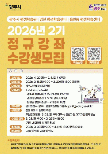 [»çȸ] ±¤ÁÖ½Ã, 2026³â 2±â Æò»ýÇнÀ ÇÁ·Î±×·¥ ¼ö°­»ý ¸ðÁý¡¦185°³ °­Á ¿î¿µ |2026. 03.06