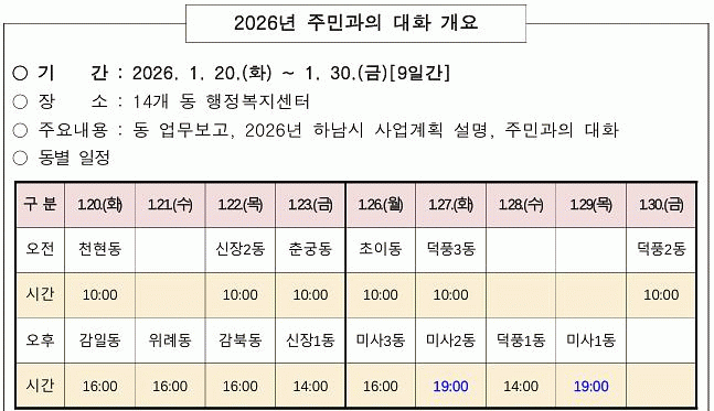[NWS¹æ¼Û=Çѽ¸ñ ±âÀÚ]Çϳ²½Ã´Â ¿À´Â 1¿ù 20ÀϺÎÅÍ 30ÀϱîÁö °ü³» °¢ µ¿ ÇàÁ¤º¹Áö¼¾Å͸¦ ¼øÈ¸ÇÏ¸ç ¡®2026³â ÁֹΰúÀÇ ´ëÈ­¡¯¸¦ °³ÃÖÇÑ´Ù°í ¹àÇû´Ù. À̹ø ÁֹΰúÀÇ ´ëÈ­´Â ½ÃÁ¤ ¿î¿µ ¹æÇâÀ» ½Ã¹Îµé°ú Åõ¸íÇÏ°Ô °øÀ¯Çϰí, »ýȰ ÇöÀå¿¡¼­ ´À¡¦