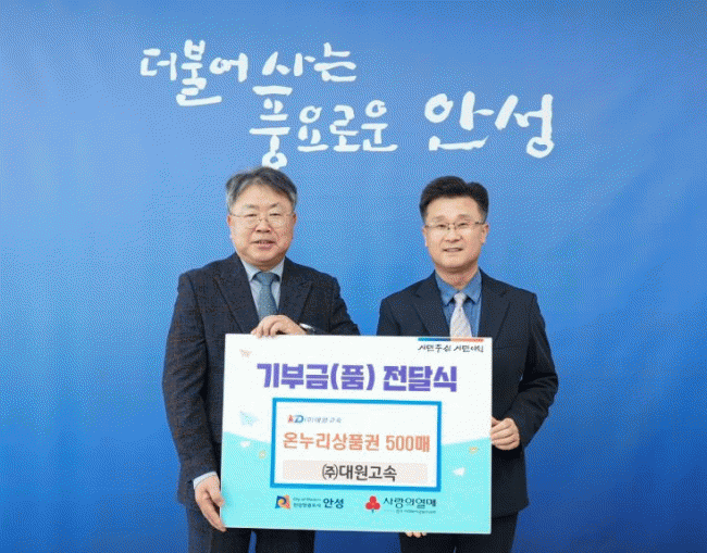 [NWS¹æ¼Û=Çѽ¸ñ ±âÀÚ]¾È¼º½Ã´Â 2¿ù 3ÀÏ ´ë¿ø°í¼ÓÀ¸·ÎºÎÅÍ Áö¿ªÀÇ ¾î·Á¿î ÀÌ¿ôÀ» µ½±â À§ÇÑ ¿Â´©¸®»óǰ±Ç 500¸Å(500¸¸ ¿ø »ó´ç)¸¦ Àü´Þ¹Þ¾Ò´Ù°í ¹àÇû´Ù. À̳¯ Àü´Þ½Ä¿¡´Â ´ë¿ø°í¼Ó ±âȹÁ¶Á¤½Ç Çã´öÇà ½ÇÀåÀÌ Âü¼®ÇØ ³ª´®ÀÇ ¶æÀ» ÀüÇßÀ¸¸ç¡¦