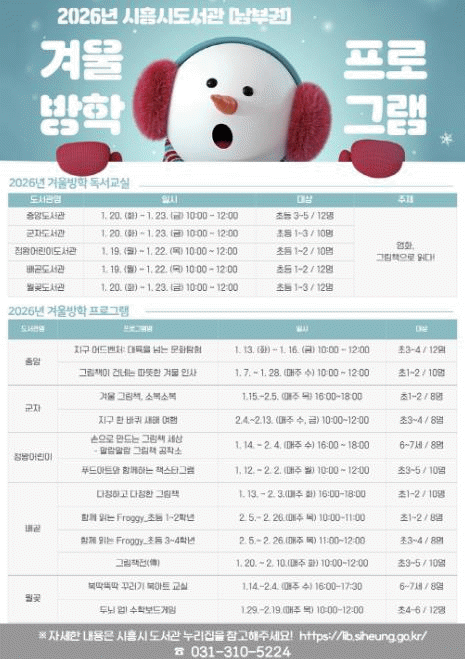[NWS¹æ¼Û=Çѽ¸ñ ±âÀÚ]½ÃÈï½ÃÁß¾Óµµ¼­°ü µî 5°³ ³²ºÎ±Ç °ø°øµµ¼­°ü(Áß¾Ó¤ý±ºÀÚ¤ýÁ¤¿Õ¾î¸°À̤ý¹è°ð¤ý¿ù°ù)Àº °Ü¿ï¹æÇÐÀ» ¸ÂÀÌÇÑ ¾î¸°À̵éÀ» À§ÇØ ¡®2026³â °Ü¿ïµ¶¼­±³½Ç ¹× °Ü¿ï¹æÇÐ ÇÁ·Î±×·¥¡¯À» ¿À´Â 2026³â 1¿ù 7ÀϺÎÅÍ 2¿ù 26ÀϱîÁö ¿î¡¦