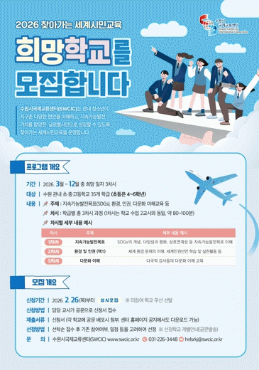 [NWS¹æ¼Û=Çѽ¸ñ ±âÀÚ]¼ö¿ø½Ã±¹Á¦±³·ù¼¾ÅͰ¡ ¡®2026 ã¾Æ°¡´Â ¼¼°è½Ã¹Î±³À°¡¯¿¡ Âü°¡ÇÒ Çб³¸¦ ¸ðÁýÇÑ´Ù. ¡®Ã£¾Æ°¡´Â ¼¼°è½Ã¹Î±³À°¡¯Àº ÇлýµéÀÌ Áö±¸ÃÌ ÁÖ¿ä Çö¾È°ú Áö¼Ó°¡´É¹ßÀü¡¤È¯°æ¡¤À뱂 °¡Ä¡ µîÀ» ÀÌÇØÇÏ¸ç ±Û·Î¹ú ½Ã¹ÎÀ¸·Î ¼ºÀ塦