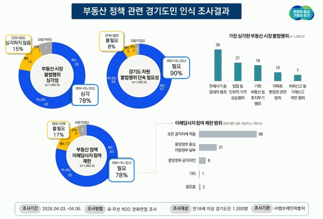 [NWS¹æ¼Û=Çѽ¸ñ ±âÀÚ]°æ±âµµ¹ÎÀÇ 78%´Â ÇöÀç ºÎµ¿»ê ½ÃÀåÀÇ ºÒ¹ýÇàÀ§¸¦ ½É°¢ÇÏ°Ô ÀνÄÇϰí ÀÖÀ¸¸ç °æ±âµµ Â÷¿øÀÇ ´Ü¼Ó °­È­ Çʿ伺¿¡´Â 90% µµ¹ÎÀÌ °ø°¨ÇÑ´Ù´Â Á¶»ç°á°ú°¡ ³ª¿Ô´Ù. °æ±âµµ°¡ 4¿ù 3ÀϺÎÅÍ 6ÀϱîÁö µµ¹Î 1,000¸íÀ» ´ë»óÀ¸¡¦