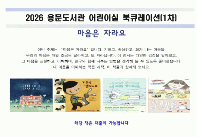[NWS¹æ¼Û=Çѽ¸ñ ±âÀÚ]¾çÆò±ºÀº ¿À´Â 4¿ù 1ÀϺÎÅÍ 5¿ù 31ÀϱîÁö ¿ë¹®µµ¼­°ü ¾î¸°ÀÌÀÚ·á½Ç¿¡¼­ ¡®¸¶À½Àº ÀÚ¶ó¿ä¡¯¸¦ ÁÖÁ¦·Î ÇÑ µµ¼­ Ãßõ ¼­ºñ½º(ºÏ Å¥·¹À̼Ç)¸¦ ¿î¿µÇÑ´Ù°í ¹àÇû´Ù. À̹ø µµ¼­ Ãßõ ¼­ºñ½º´Â ¾î¸°À̵éÀÌ ´Ù¾çÇÑ °¨Á¤À» ÀÌ¡¦