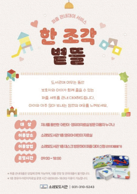 [NWS¹æ¼Û=Çѽ¸ñ ±âÀÚ]½ÃÈï½Ã ¼Ò·¡ºûµµ¼­°üÀº ¾î¸°À̸¦ À§ÇÑ °ü³» ÆÛÁñ ´ë¿© ¼­ºñ½º ¡®ÇÑ Á¶°¢ ºµ¶ã¡¯À» »õ·Ó°Ô ¼±º¸ÀδÙ. ÀÌ ¼­ºñ½º´Â ºü¸¥ ¿µ»ó°ú Áï°¢ÀûÀÎ Àڱؿ¡ Àͼ÷ÇØÁø ¾ÆÀ̵éÀÌ Àá½Ã ¼Óµµ¸¦ ´ÊÃß°í, ¼Õ³¡ °¨°¢°ú ÁýÁß·ÂÀ» ÀÚ¿¬½º¡¦