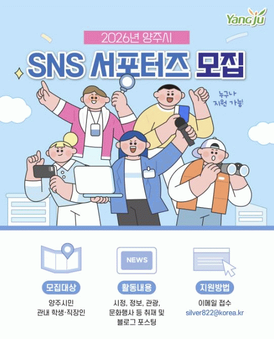 [»çȸ] "¾çÁÖ½ÃÀÇ ¸Å·ÂÀ» ³Î¸® ¾Ë·ÁÁÖ¼¼¿ä" 2026³â ¾çÁֽà SNS ¼­Æ÷ÅÍÁî ¸ðÁý |2025. 11.27