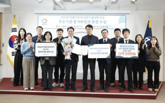 [NWS¹æ¼Û=Çѽ¸ñ ±âÀÚ]¾È¾ç½Ã´Â Áß¼Òº¥Ã³±â¾÷ºÎ°¡ ÁÖ°üÇÑ ¡®2025³â ÀüÅë½ÃÀå ¹× »óÁ¡°¡ Ȱ¼ºÈ­ À¯°ø¡¯ Æ÷»ó¿¡¼­ ¿ì¼ö ÁöÀÚü·Î ¼±Á¤µÅ Áß¼Òº¥Ã³±â¾÷ºÎ Àå°ü ǥâÀ» ¼ö»óÇß´Ù°í 19ÀÏ ¹àÇû´Ù. À̹ø Æ÷»óÀº Áß±âºÎ°¡ ¸Å³â ÀüÅë½ÃÀå°ú »óÁ¡°¡¡¦