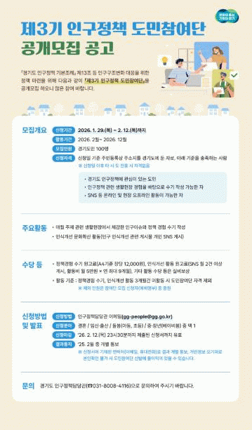 [»çȸ] °æ±âµµ, 'Á¦3±â Àα¸Á¤Ã¥ µµ¹ÎÂü¿©´Ü' 100¸í ¸ðÁý¡¦Á¤Ã¥¡¤ÀÎ½Ä °³¼±È°µ¿ |2026. 02.04
