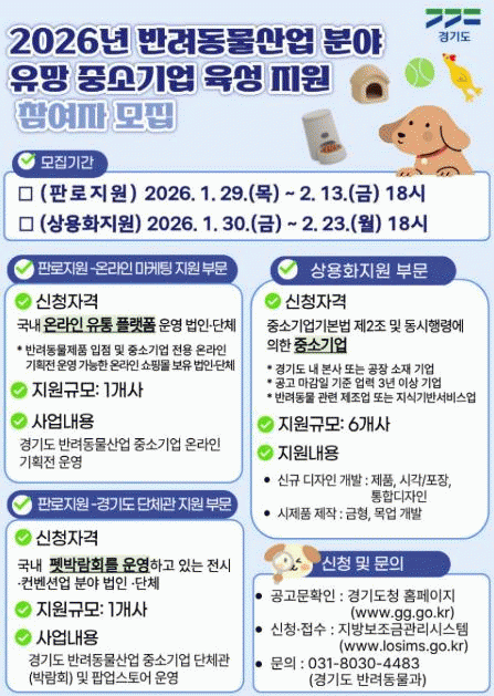 [»çȸ] °æ±âµµ, ¹Ý·Áµ¿¹°»ê¾÷ ºÐ¾ß À¯¸Á Áß¼Ò±â¾÷ À°¼º Áö¿ø»ç¾÷ º¸Á¶»ç¾÷ÀÚ ¸ðÁý |2026. 02.04
