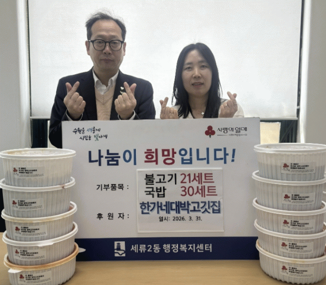 [NWS¹æ¼Û=Çѽ¸ñ ±âÀÚ]Áö³­ 31ÀÏ, ¼ö¿ø½Ã ±Ç¼±±¸ ¼¼·ù2µ¿¿¡ À§Ä¡ÇÑ ÇѰ¡³× ´ë¹Ú°í±êÁýÀº ±¹¹ä 30±×¸©°ú ºÒ°í±â 20¼¼Æ®¸¦ ¼¼·ù2µ¿ÇàÁ¤º¹Áö¼¾ÅÍ¿¡ ±âŹÇß´Ù. À̹ø¿¡ ±âºÎµÈ ¹°Ç°Àº °æÁ¦Àû ¾î·Á¿òÀ» °Þ°í ÀÖ´Â Ãë¾à°èÃþ¿¡ Àü´ÞµÉ ¿¹Á¤ÀÌ´Ù¡¦