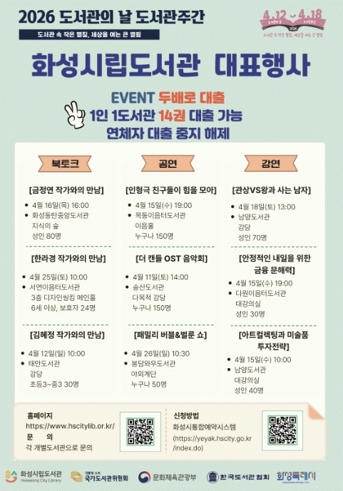 [NWS¹æ¼Û=Çѽ¸ñ ±âÀÚ]È­¼ºÆ¯·Ê½Ã´Â 4¿ù 12ÀÏ ¡®µµ¼­°üÀÇ ³¯¡¯À» ¸Â¾Æ 12ÀϺÎÅÍ 18ÀϱîÁö ¡®2026³â µµ¼­°üÁÖ°£¡¯À» ¿î¿µÇϰí, ½Ã¹ÎÀ» À§ÇÑ ´Ùä·Î¿î µ¶¼­¹®È­ Çà»ç¸¦ ¸¶·ÃÇß´Ù. À̹ø µµ¼­°üÁÖ°£¿¡´Â 32°³ ½Ã¸³µµ¼­°ü¿¡¼­ °ø¿¬, Àü½Ã, ü¡¦