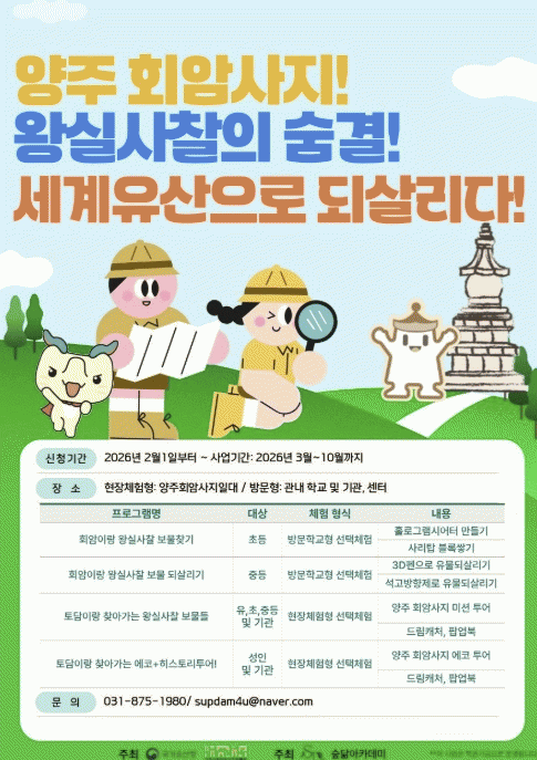 [»çȸ] ¾çÁֽø³È¸¾Ï»çÁö¹Ú¹°°ü, '¾çÁÖ È¸¾Ï»çÁö! ¿Õ½Ç»çÂûÀÇ ¼û°á! ¼¼°èÀ¯»êÀ» µÇµ¹¸®´Ù' ÇÁ·Î±×·¥ ¿î¿µ |2026. 04.10