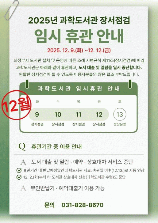[»çȸ] ÀÇÁ¤ºÎ°úÇеµ¼­°ü, Àå¼­ Á¡°ËÀ¸·Î 'Àӽà ÈÞ°ü' |2025. 11.10