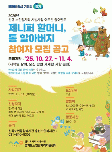 [NWS¹æ¼Û=Çѽ¸ñ ±âÀÚ]ÀÇÁ¤ºÎ½Ã´Â 2026³âµµ ³ëÀÎÀÏÀÚ¸® ½Ã¹ü»ç¾÷À¸·Î ÃßÁøµÇ´Â ¾î¸£½Å ¿µ¾î ¸àÅä ÇÁ·Î±×·¥ ¡®Á¦´ÏÆÛ ÇÒ¸Ó´Ï, Åè ÇҾƹöÁö¡¯ »ç¾÷ Âü¿©ÀÚ¸¦ ¸ðÁýÇÑ´Ù. À̹ø ÇÁ·Î±×·¥Àº 2026³â °æ±âµµ ³ëÀÎÀÏÀÚ¸® Áö¿ø¼¾ÅÍ ½Ã¹ü»ç¾÷¿¡ È