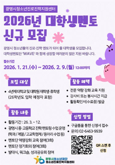 [»çȸ] ±¤¸í½Ãû¼Ò³âÁø·ÎÁøÇÐÁö¿ø¼¾ÅÍ, 2026³â ´ëÇлý¸àÅä´Ü(wave) ¸ðÁý |2026. 01.21
