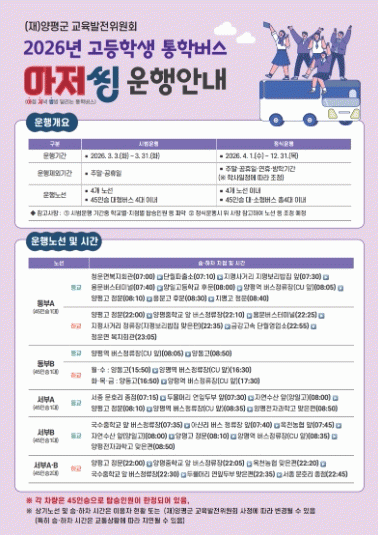 [NWS¹æ¼Û=Çѽ¸ñ ±âÀÚ](Àç)¾çÆò±º±³À°¹ßÀüÀ§¿øÈ¸´Â ¿ø°Å¸® ÇлýµéÀÇ ÅëÇÐ ºÒÆíÀ» ÇØ¼ÒÇϱâ À§ÇØ ±âÁ¸ 1°³ Áö¿ª 1´ë·Î ¿î¿µÇÏ´ø ÅëÇйö½º¸¦ ¿ÃÇØ 3¿ùºÎÅÍ 6°³ Áö¿ª, ÃÑ 4´ë·Î È®´ë ¿î¿µÇÑ´Ù°í ¹àÇû´Ù. Àç´Ü¿¡ µû¸£¸é ±âÁ¸¿¡´Â ¼­Á¾¸é¿¡¼­¡¦