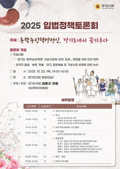 [Áö¿ªÁ¤Ä¡] ±èµ¿±Ô ÀÇ¿ø, '°æ±âµµ µ¿Çгó¹ÎÇõ¸í ±â³ä»ç¾÷ Á¶·Ê' Á¦Á¤À» À§ÇÑ ÀÔ¹ýÁ¤Ã¥Åä·Ðȸ °³ÃÖ |2025. 10.22