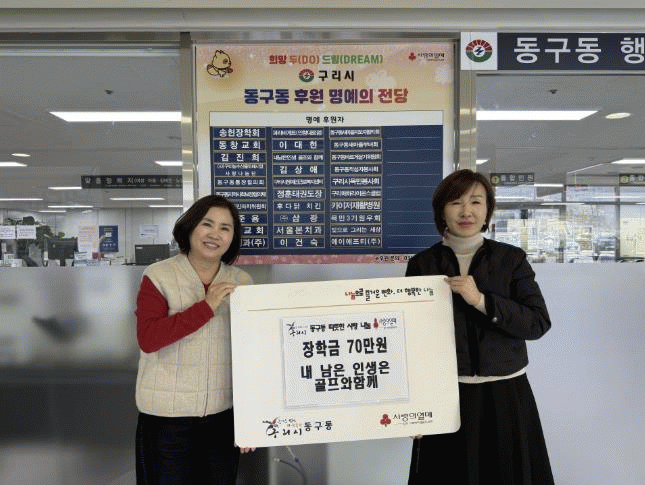 [NWS¹æ¼Û=Çѽ¸ñ ±âÀÚ]±¸¸®½Ã µ¿±¸µ¿ ÇàÁ¤º¹Áö¼¾ÅÍ´Â Áö³­ 18ÀÏ µ¿±¸µ¿ ÇàÁ¤º¹Áö¼¾ÅÍ ´ëȸÀǽǿ¡¼­ '³» ³²Àº ÀλýÀº °ñÇÁ¿Í ÇÔ²²' ¸ðÀÓÀ¸·ÎºÎÅÍ °ü³» Ãë¾à°èÃþ û¼Ò³âÀ» À§ÇÑ ÀåÇÐ±Ý 70¸¸ ¿øÀ» ±âŹ¹Þ¾Ò´Ù°í ¹àÇû´Ù. À̹ø ÀåÇбÝÀº ¾î·Á¡¦