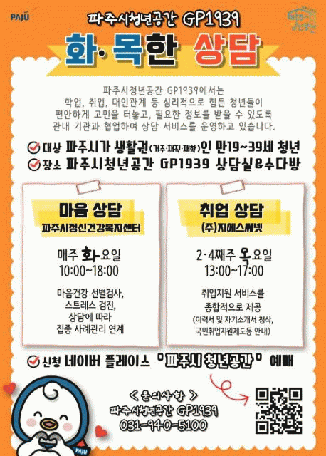 [NWS¹æ¼Û=Çѽ¸ñ ±âÀÚ]ÆÄÁֽô û³âµéÀÇ ½É¸® ¾ÈÁ¤°ú Ãë¾÷ ¿ª·® °­È­¸¦ À§ÇØ ÆÄÁÖ½Ãû³â°ø°£ ÁöÇÇ(GP)1939¿¡¼­ ÁøÇàÇÏ´Â »ó´ã ÇÁ·Î±×·¥ ¡®È­¡¤¸ñÇÑ »ó´ã¡¯ÀÇ Âü¿©ÀÚ¸¦ ¸ðÁýÇÑ´Ù. ¡®È­¡¤¸ñÇÑ »ó´ã¡¯Àº ¿äÀϺ°·Î »ó´ã ÁÖÁ¦¸¦ ³ª´² ÁøÇàÇÏ¡¦