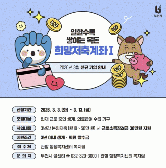 [»çȸ] ºÎõ½Ã, 2026³â Èñ¸ÁÀúÃà°èÁÂ(¥°) °¡ÀÔÀÚ ¸ðÁý¡¦ÃÖ´ë 1,440¸¸ ¿ø Áö¿ø |2026. 02.27