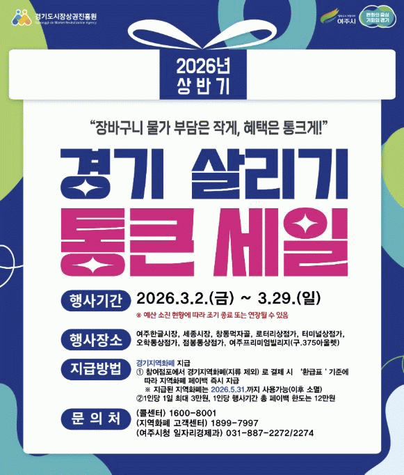 [NWS¹æ¼Û=Çѽ¸ñ ±âÀÚ]°æ±âµµ½ÃÀå»ó±ÇÁøÈï¿ø¿¡¼­ ÁÖ°üÇÏ´Â ¡®2026³â »ó¹Ý±â °æ±â»ì¸®±â ÅëÅ«¼¼ÀÏ¡¯ÀÌ ¿©Áֽà °ü³» ÀüÅë½ÃÀå ¹× »óÁ¡°¡¿¡¼­µµ ÁøÇàµÈ´Ù. ¡®°æ±â»ì¸®±â ÅëÅ«¼¼ÀÏ¡¯Àº ¼ÒºñÁøÀÛ°ú Áö¿ª»ó±Ç ȸº¹À» À§ÇÑ ÆäÀ̹é À̺¥Æ® Çà»ç·Î¡¦