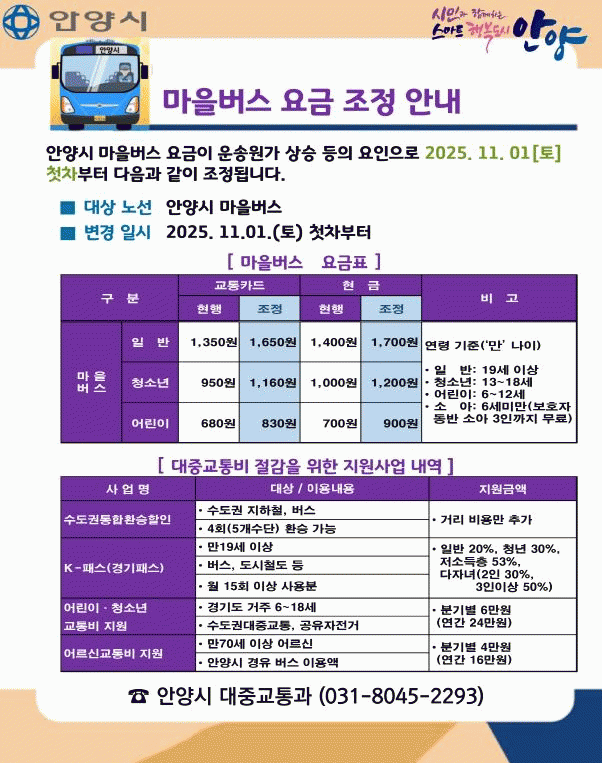 [»çȸ] ¾È¾ç½Ã, ³»´Þ 1ÀϺÎÅÍ ¸¶À»¹ö½º ¿ä±Ý 'ÀÏ¹Ý 1,650¿ø'À¸·Î Àλó |2025. 10.22