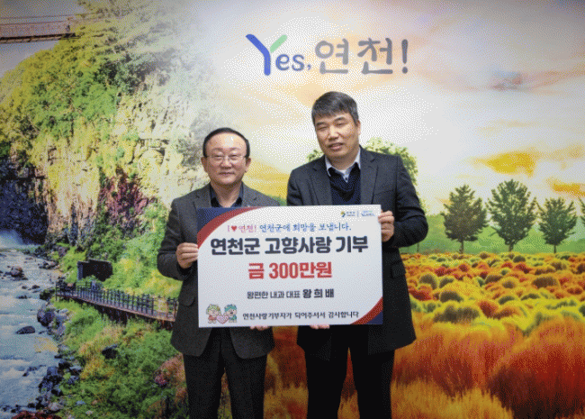 [NWS¹æ¼Û=Çѽ¸ñ ±âÀÚ]¿¬Ãµ±ºÀº Áö³­ 5ÀÏ Àü°îÀ¾ ¼ÒÀç ¡®¿ÕÆíÇѳ»°úÀÇ¿ø¡¯ÀÇ ¿ÕÈñ¹è ´ëÇ¥¿øÀåÀÌ °íÇâ»ç¶û±âºÎÁ¦¿¡ 300¸¸ ¿øÀ» ±âŹÇß´Ù°í ¹àÇû´Ù. ¿ÕÈñ¹è ´ëÇ¥¿øÀåÀº ¹éÇÐÃÊ¡¤¹éÇÐÁß¡¤Àü°î°í¸¦ Á¹¾÷ÇÑ ¿¬Ãµ Ãâ½Å ÀÇ·áÀÎÀ¸·Î, Áö¿ªÀ» ¶°³ª¡¦