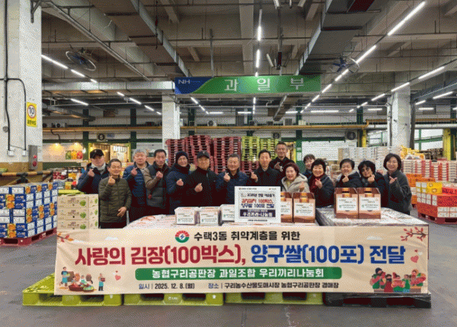 [»çȸ] ±¸¸®½Ã ¼öÅÃ3µ¿, ¿ì¸®³¢¸®³ª´®È¸·ÎºÎÅÍ ±èÀå ±èÄ¡ 100¹Ú½º¡¤¾ç±¸ ½Ò 100Æ÷ ÈÄ¿ø¹Þ¾Æ |2025. 12.08
