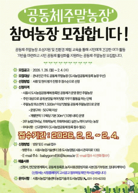[»çȸ] ½ÃÈï½Ã '2026³â °øµ¿Ã¼ ÁÖ¸»³óÀå Á¶¼º¡¤¿î¿µ Áö¿ø»ç¾÷' Âü¿© ´ë»ó ¸ðÁý |2026. 01.30