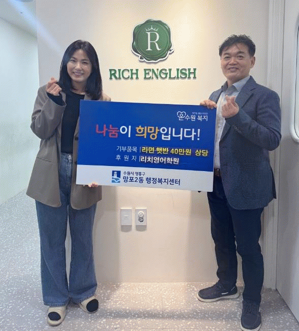 [NWS¹æ¼Û=Çѽ¸ñ ±âÀÚ]¼ö¿ø½Ã ¿µÅ뱸 ¸ÁÆ÷2µ¿Àº Áö³­ 27ÀÏ ¸ÁÆ÷2µ¿ ¼ÒÀç ¸®Ä¡¿µ¾îÇпø Çпø»ý°ú ±³Á÷¿øµéÀÌ ÀÚ¹ßÀûÀ¸·Î ¸ð±ÝÇÑ ¼º±ÝÀ¸·Î ¸¶·ÃÇÑ 40¸¸ ¿ø »ó´çÀÇ ¶ó¸é°ú ÇÞ¹ÝÀ» ±âŹÇß´Ù°í ¹àÇû´Ù. ¸®Ä¡¿µ¾îÇпøÀº 2024³â ¿¬¸» Çпø»ýµéÀÇ¡¦