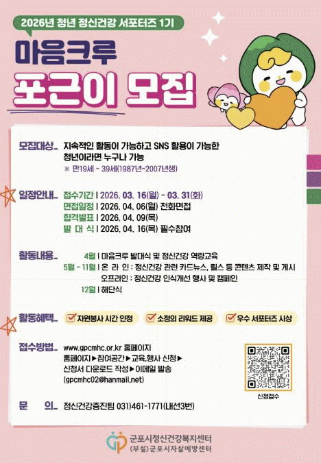 [NWS¹æ¼Û=Çѽ¸ñ ±âÀÚ]±ºÆ÷½ÃÁ¤½Å°Ç°­º¹Áö¼¾ÅÍ´Â Áö¿ª»çȸ Á¤½Å°Ç°­ ÀÎ½Ä °³¼±°ú »ý¸íÁ¸Áß ¹®È­ È®»êÀ» À§ÇØ Ã»³â Á¤½Å°Ç°­ ¼­Æ÷ÅÍÁî 1±â ¡®Æ÷±ÙÀÌ¡¯¸¦ 3¿ù 16ÀϺÎÅÍ 3¿ù 31ÀϱîÁö ¸ðÁýÇÑ´Ù. ¡®Æ÷±ÙÀÌ¡¯´Â ¡®µû¶æÇÏ°Ô ¾È¾ÆÁÖ°í °çÀ» ÁöÄÑ¡¦